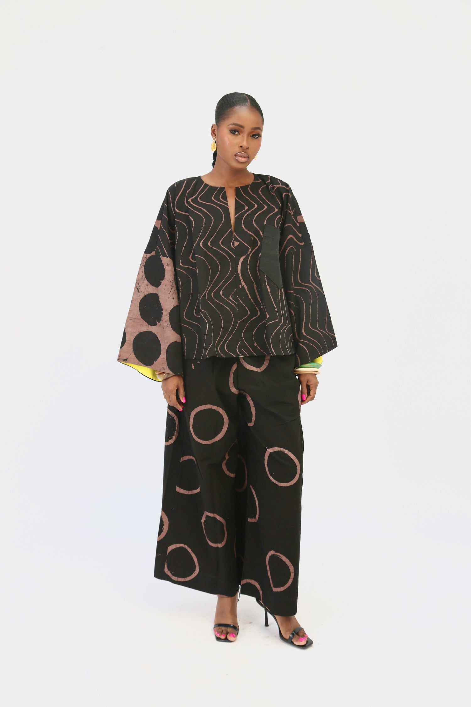 BRIGHT MULTICOLOURED AGBADA WITH YELLOW AND BROWN BOTTOM AND PEACH ASOOKE WITH HOLES