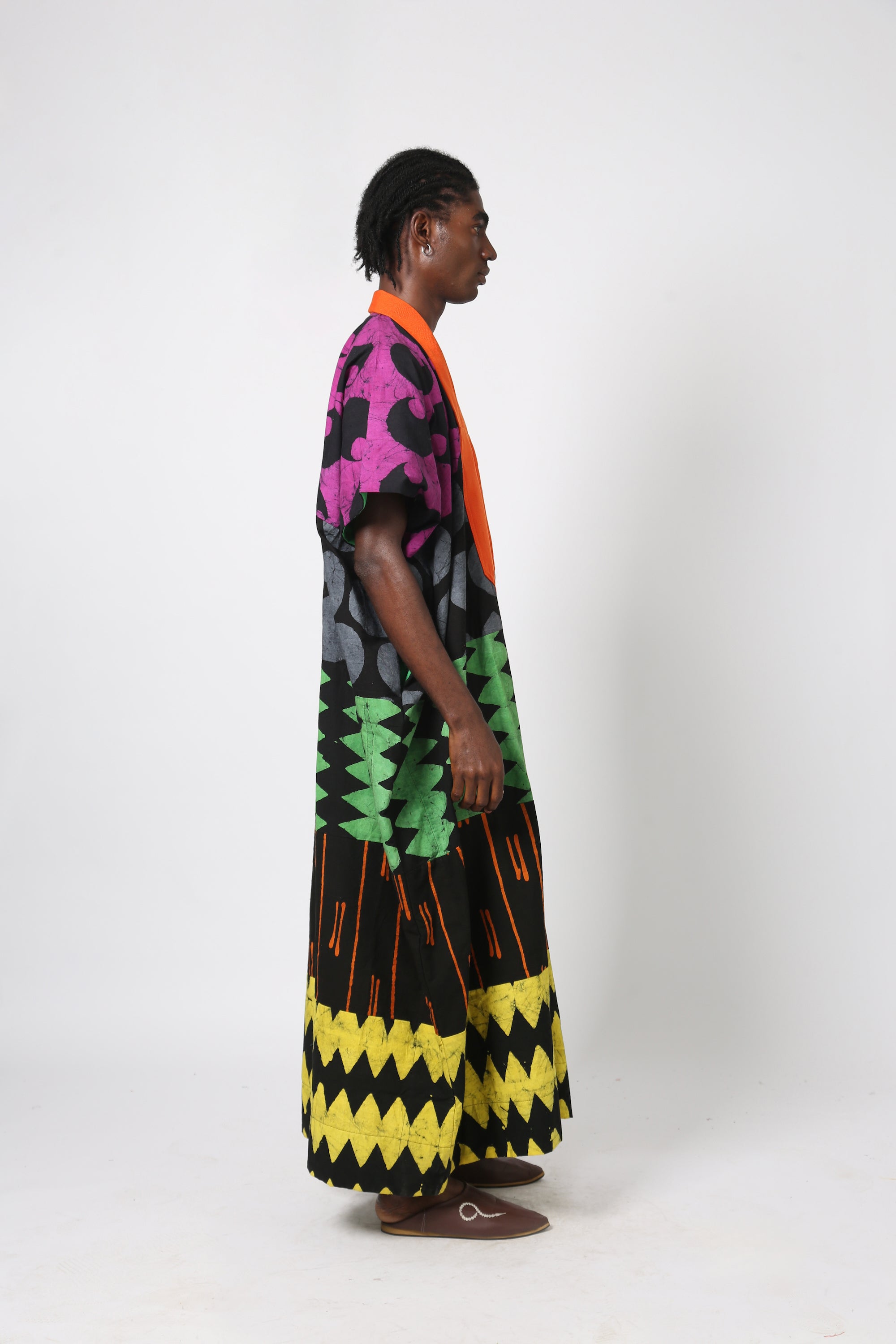 Agbada in dark multicolored print with hand-woven Aso Oke in orange
