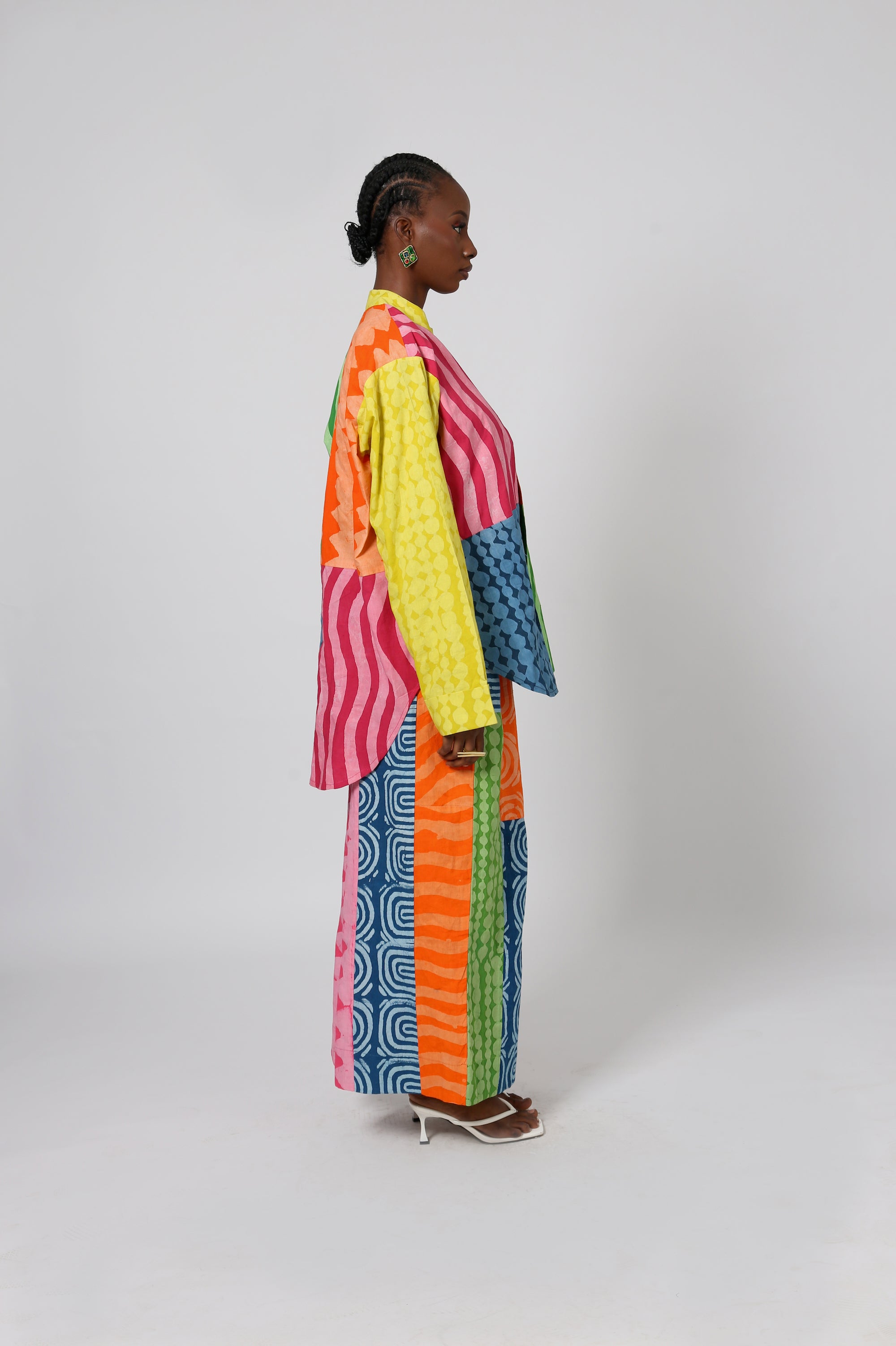 Each Dye Lab piece is made from small batches of hand-dyed textiles using batik wax to achieve our own formulated colors and prints and produced in Nigeria working with local artisans.