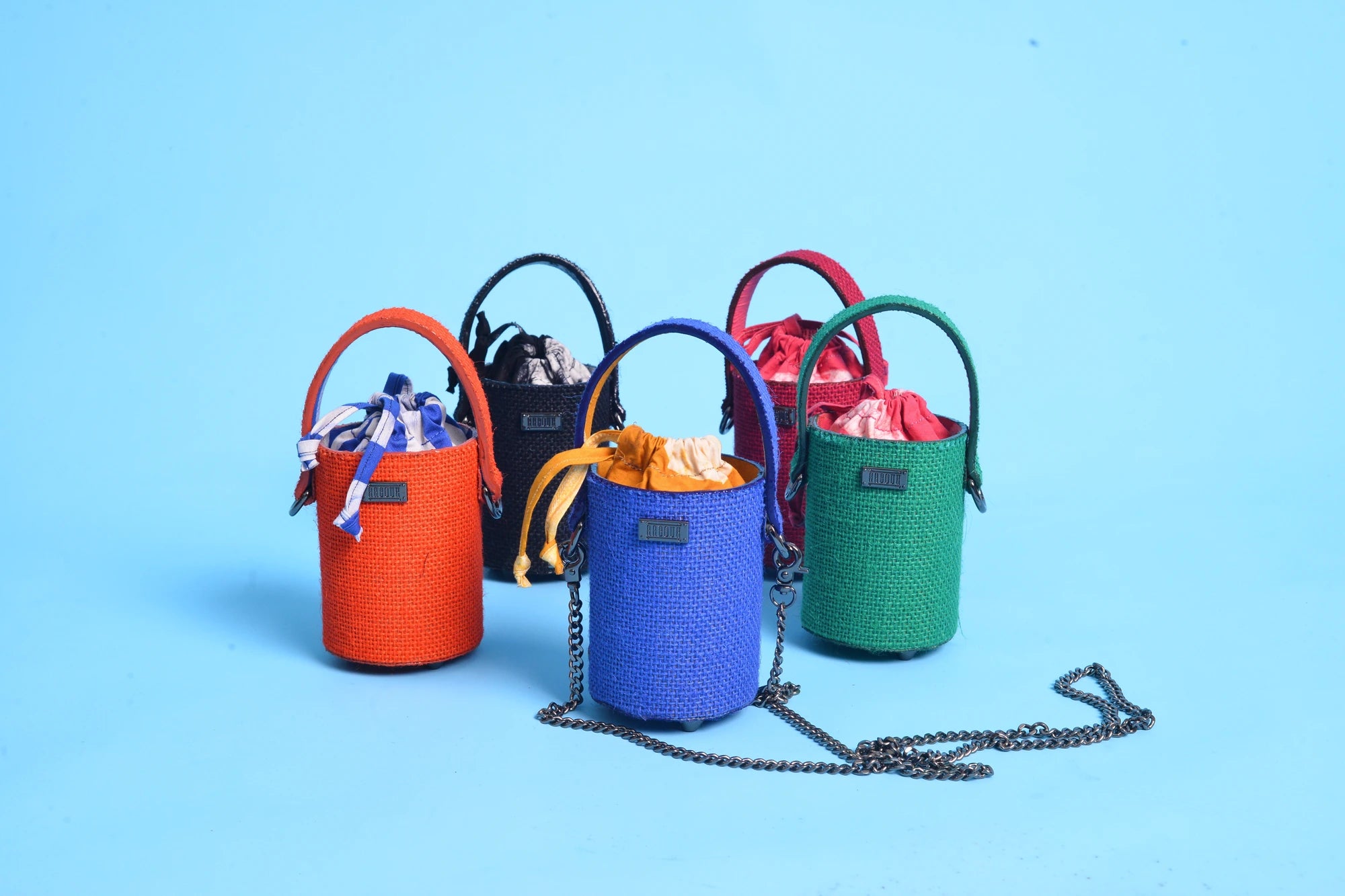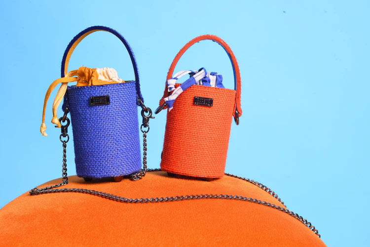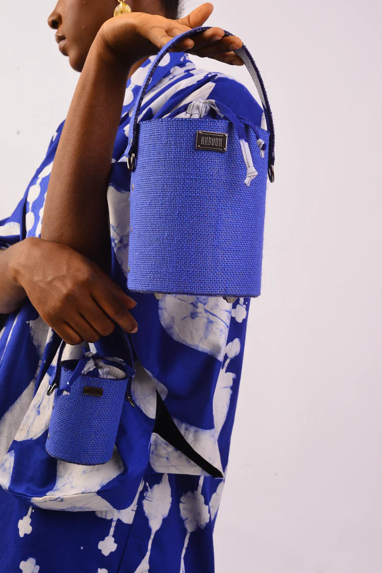 Dye Lab collaborated with luxury leather accessory brand Aaboux on a limited edition range of mini and maxi bucket bags crafted out of jute and our statement prints.