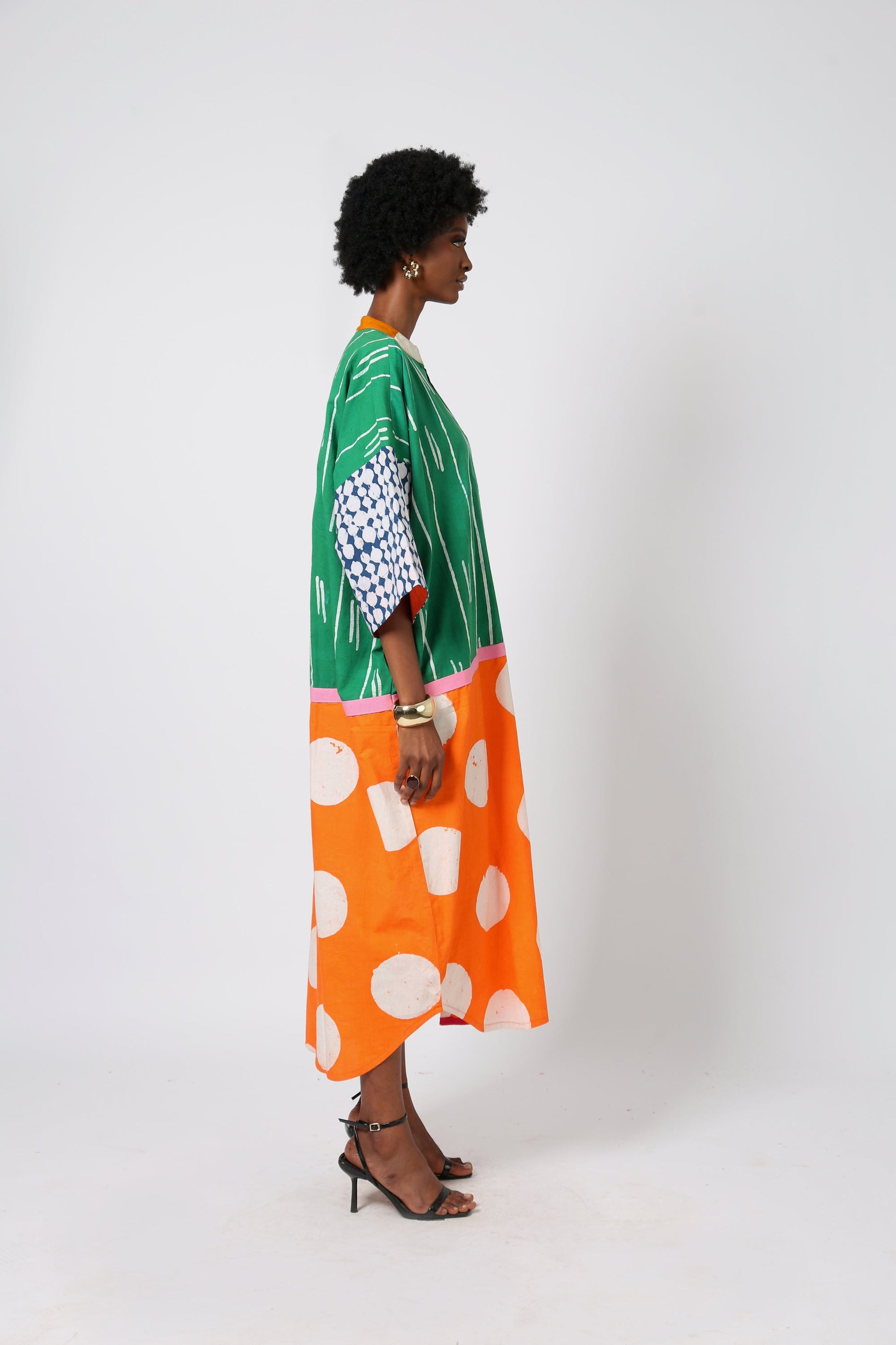 GREEN AND WHITE MULTICOLORED KAFTAN WITH PINK ASO OKE OUTLINE