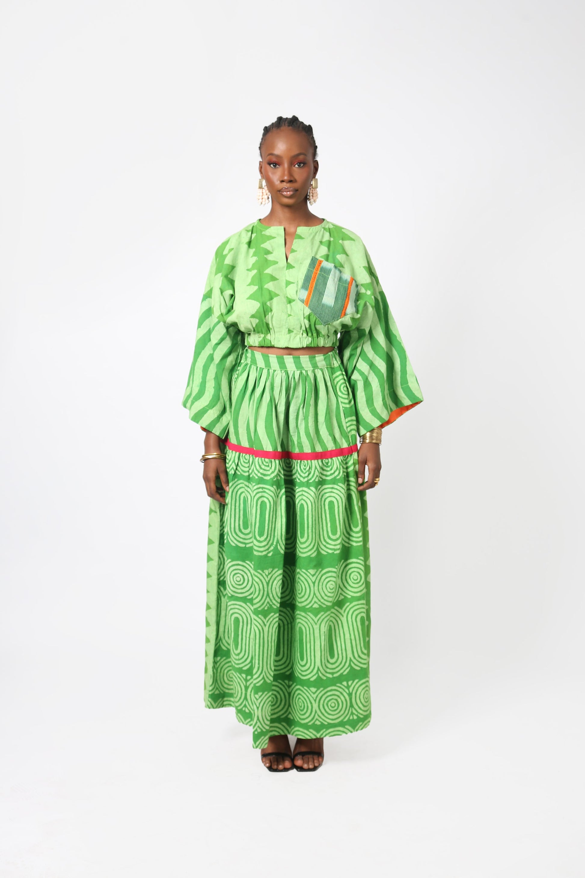 Buba style Crop Shirt in lemon and light lemon print, with our Ivorian sourced, hand-woven Baule-kita