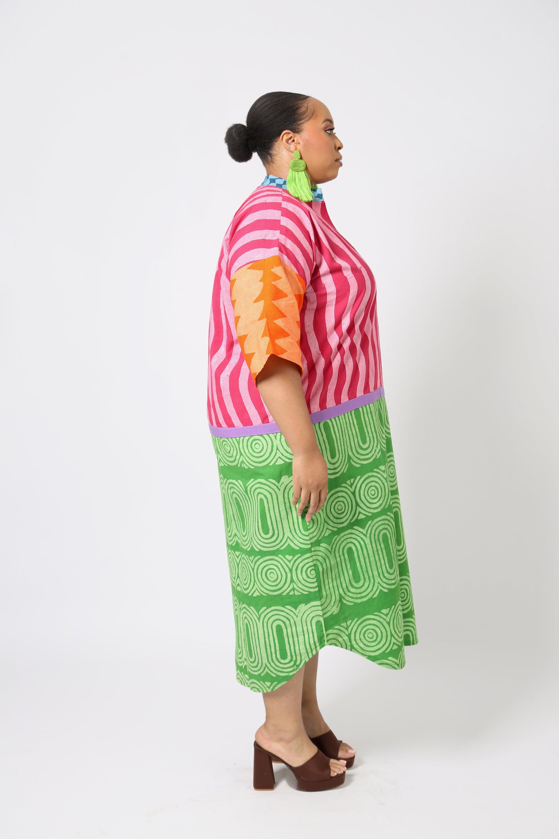 Kaftan in multicolored pink and green print with a lilac Aso Oke outline.