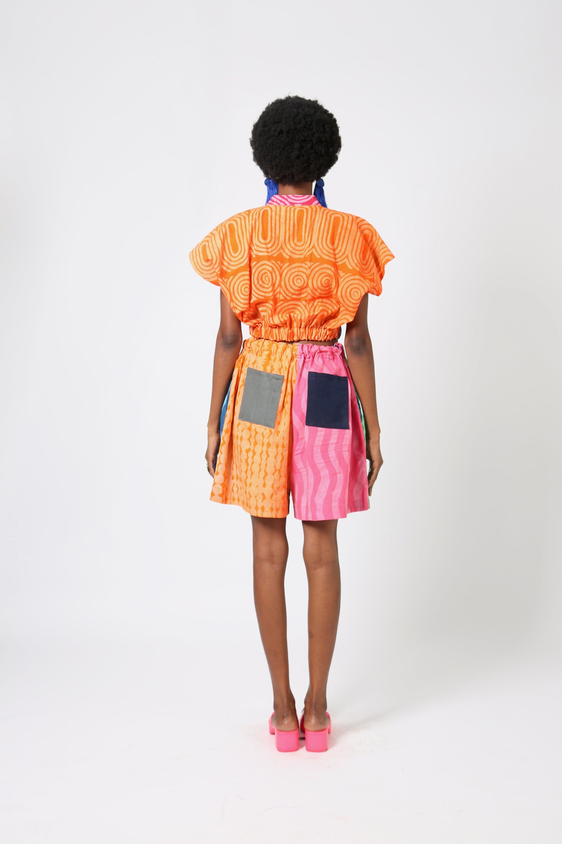 Each Dye Lab piece is made from small batches of hand dyed textiles using batik wax to achieve our own formulated colors and prints and produced in Nigeria working with local artisans.