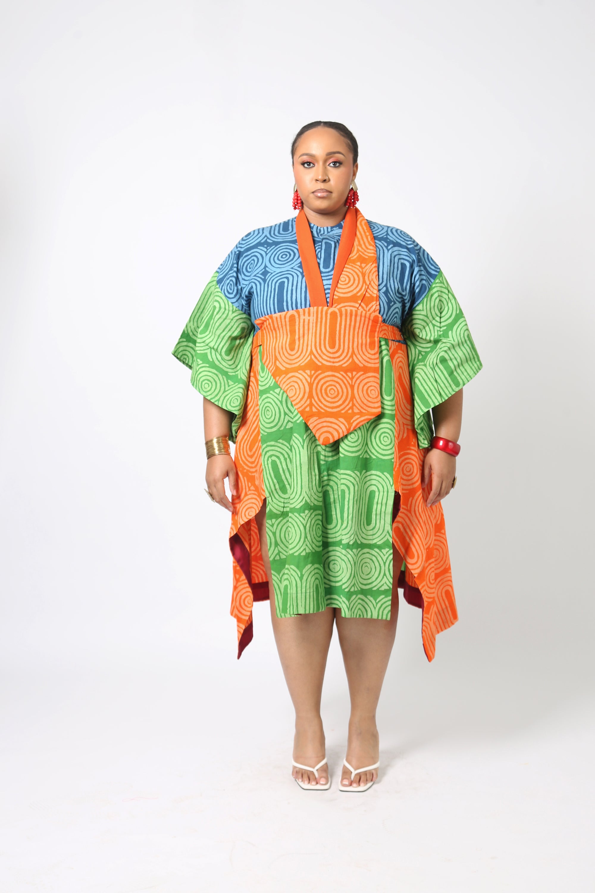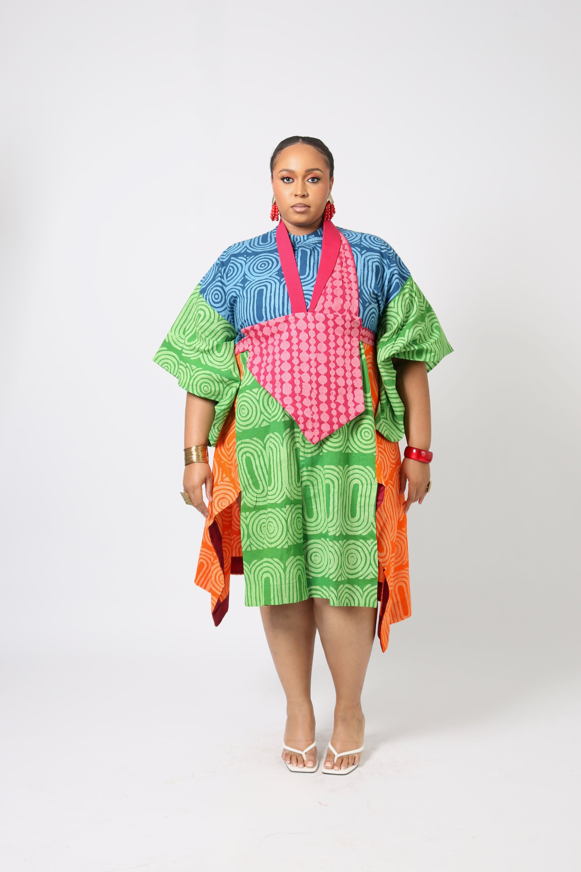 Shirtdress in multicolored teal and lemon print. Made from 100% cotton Styled as pictured, with matching Bib and CulottesTechnical DetailsMade from Funtua cottonLength - 47”Available in one size (UK 8 - UK 18)Model is UK 20/22 Each Dye Lab piece...