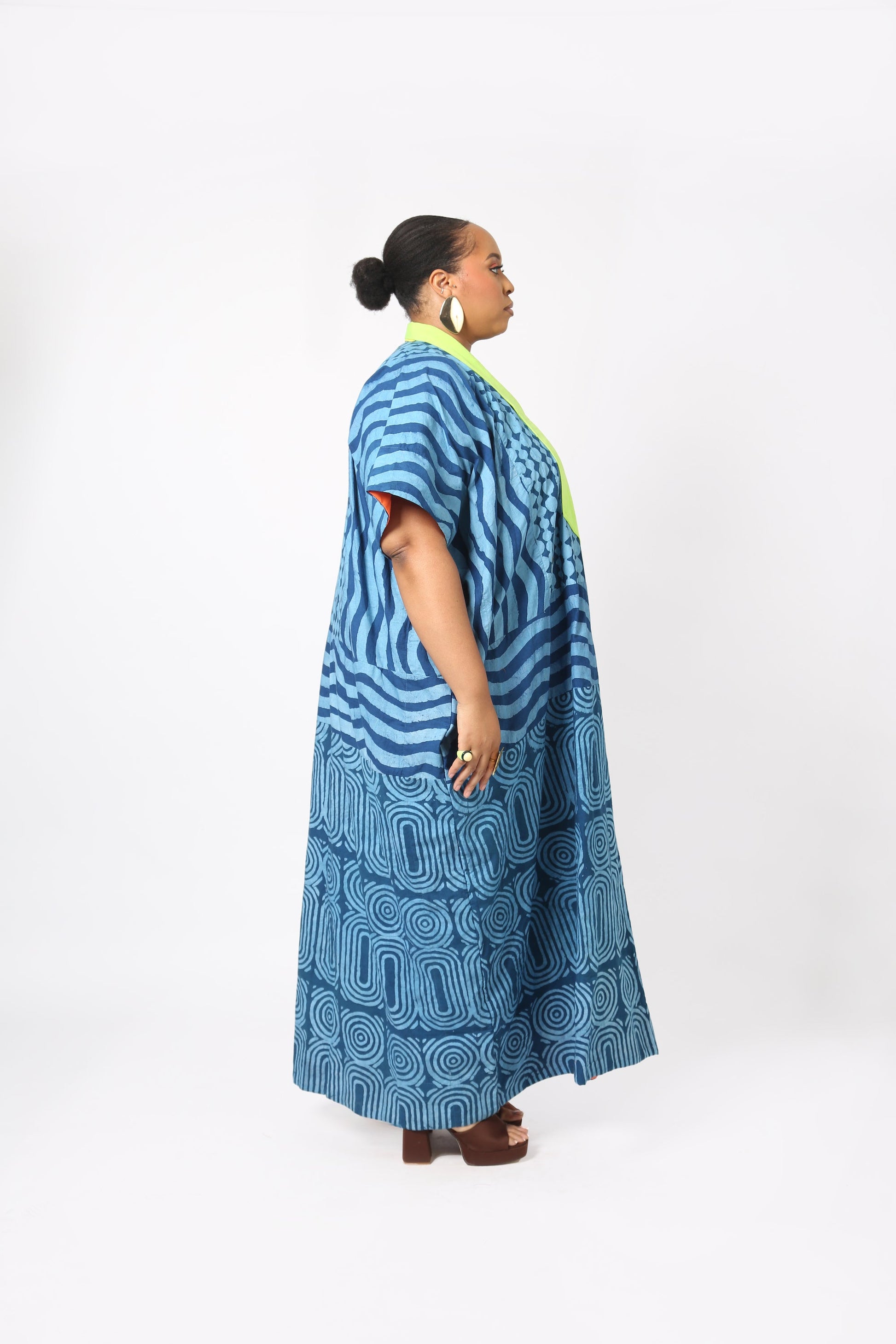 Agbada in teal and light teal print, with hand-woven Aso Oke in lemon.